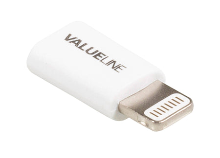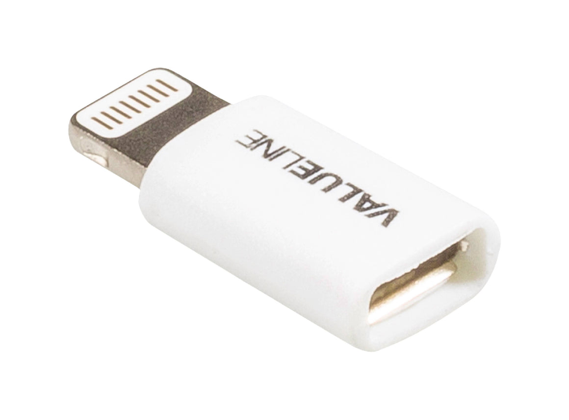 Adaptor iPhone Lightning tata - micro USB mama alb Valueline. Adaptor rapid Apple Lightning tata - USB Micro B mama Alb. Acest adaptor, în combina?ie cu un cablu Micro USB, este potrivit pentru sincronizarea sau înc?rcarea unui dispozitiv Apple cu computerul.