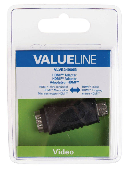 Connection A: HDMI mini Male. Accesoriu: Adaptor Tip: HDMI mini Tip conexiune: mini HDMI?HDMI Conector: HDMI A Conector: mini HDMI tata B Conector: HDMI mama Standard: Cu Ethernet Marca: Valueline Garantie: 24 luni persoane fizice / 12 luni persoane juridice
