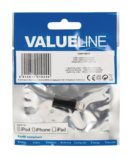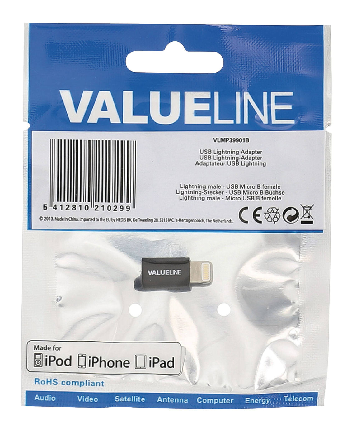 Connection A: Apple Lightning Accesoriu: Adaptor Compatibil: Apple Tip conexiune: micro USB?Apple Conector: Apple Conector: USB micro A Conector: Apple B Conector: micro USB mama Standard: USB 2.0 Marca: Valueline Garantie: 24 luni persoane fizice / 12 luni persoane juridice