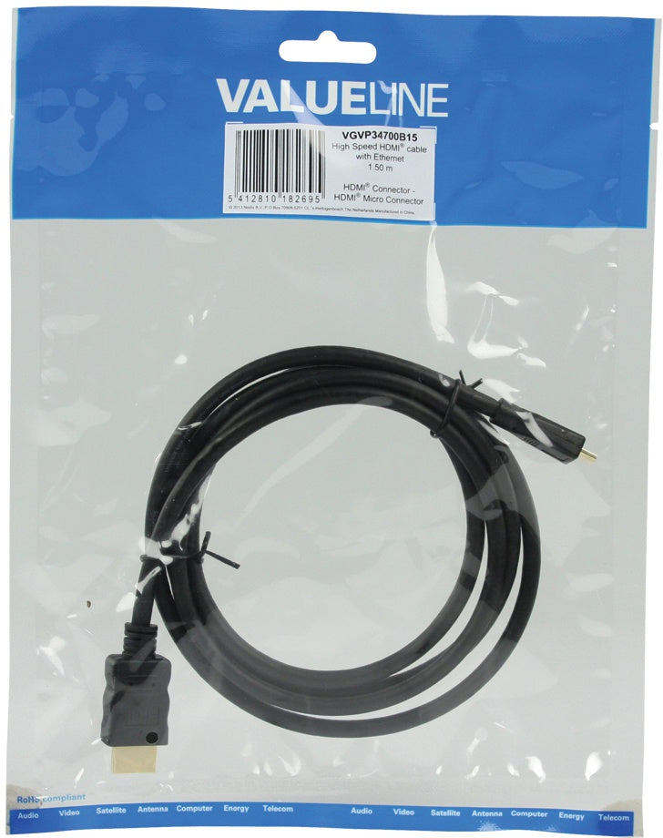 Rezolu?ia imaginii 3840 x 2160. Tip conexiune: HDMI?HDMI Conector: HDMI A Conector: micro HDMI (D) tata B Conector: HDMI tata Standard: Cu Ethernet Lungime: 1.5 m Marca: Valueline Garantie: 24 luni persoane fizice / 12 luni persoane juridice