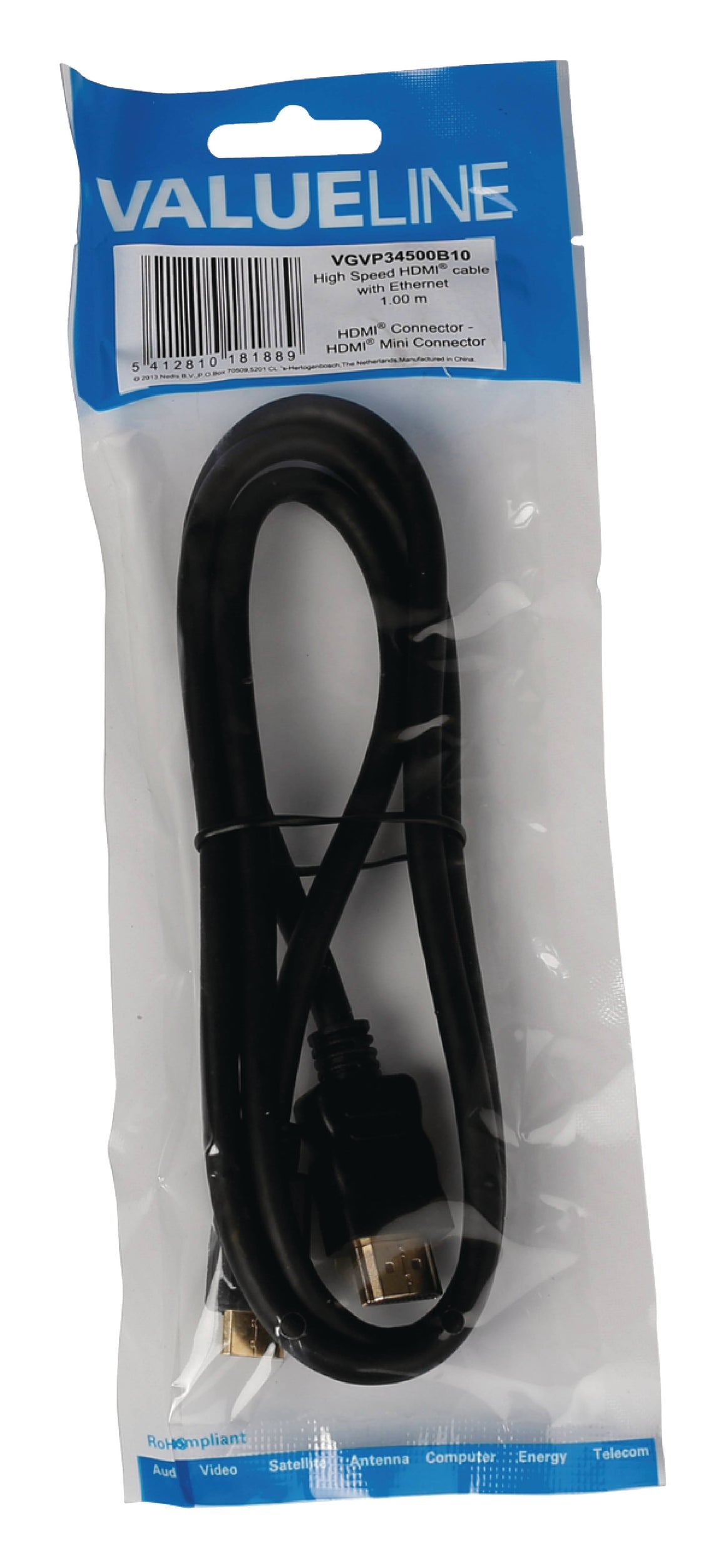 Placare Aur. Accesoriu: Cablu Tip: HDMI mini Tip conexiune: HDMI?HDMI Conector: HDMI A Conector: mini HDMI tata B Conector: HDMI tata Cablu: Video Standard: 2K Standard: 4K Ultra HD Standard: Hight Speed Standard: Full HD 1920 x 1080p Standard: Cu Ethernet Standard: 3D Lungime: 1 m Culoare: Negru Marca: Valueline Garantie: 24 luni persoane fizice / 12 luni persoane juridice