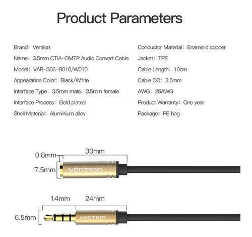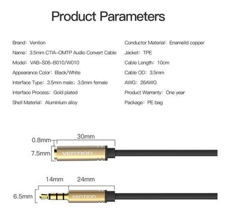 Cablu Jack 3.5 mm 4 pin socket Jack 3.5 mm 4 pin plug 0.1m negru VENTION VAB-S06-B010.