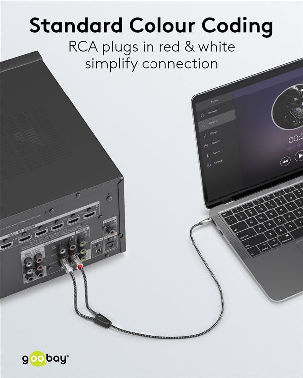 Cablu RCA premium extrem de flexibil, cu mufe metalice subțiri, protecție la îndoire și un cablu textil asortat culorilor