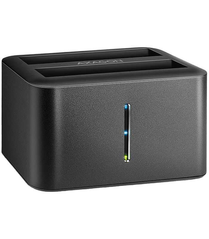 Stația de andocare/clonare SuperSpeed USB 5 Gbps AXAGON ADSA-D25 CLONE MINI conectează rapid și ușor până la două discuri de 2,5" la computer în același timp.