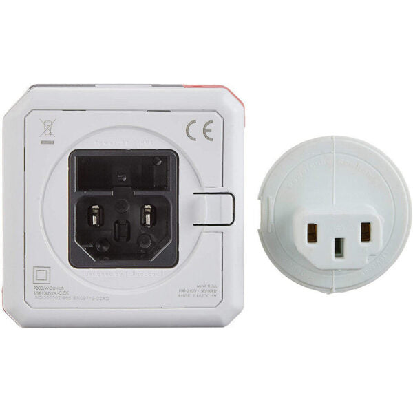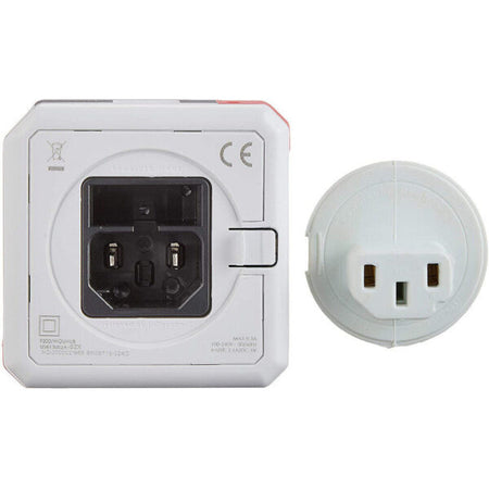 La partea din spate este prevazut un conector IEC, care faciliteaza conectarea unui cablu standard de calculator / imprimanta a lungimii pe care o preferati sau o utilizati cu unul dintre dopurile noastre de calatorie pentru incarcarea directa a peretelui.