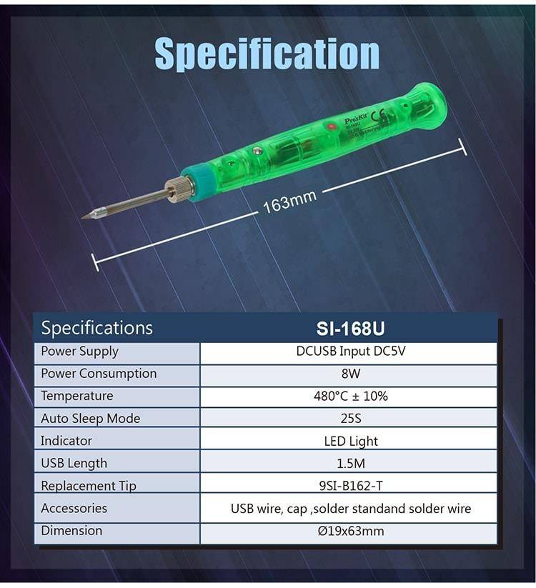 Indicator de alimentare pentru a evita arsurile accidentale. Accesoriu: Ciocan de lipit Conector: USB A A Conector: USB A tata Tensiune intrare: USB 5 V DC Putere W: 8 W Marca: Pro'sKit Garantie: 24 luni persoane fizice / 12 luni persoane juridice