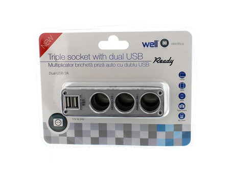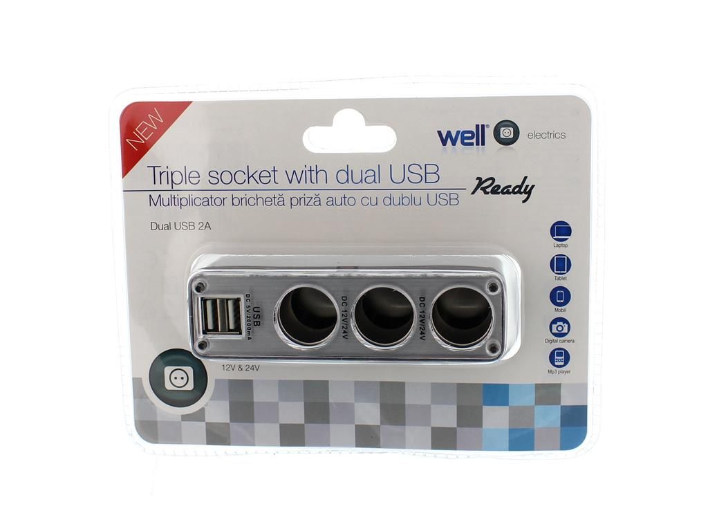 Multiplicator bricheta auto cu 3 iesiri si 2 iesiri USB 5V 2A 50W Well