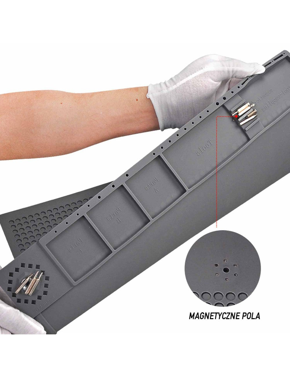 Are un organizator incapator numerotat pentru unelte si elemente rasucite. Campurile magnetice va permit sa detasati convenabil suruburile in timpul desurubarii si sa cresteti confortul de lucru.