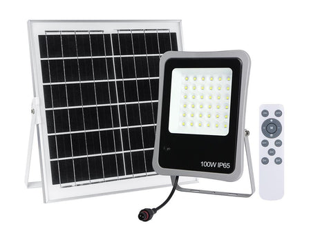 Proiectorul LED cu o putere de 100W beneficiaza de un panou solar cu ajutorul caruia se incarca, fiind o alegere ideala pentru a fi folosit in locurile fara surse de energie electrica: casa de vacanta, gradina, curte, cabana etc. sau pentru a economisi banii.