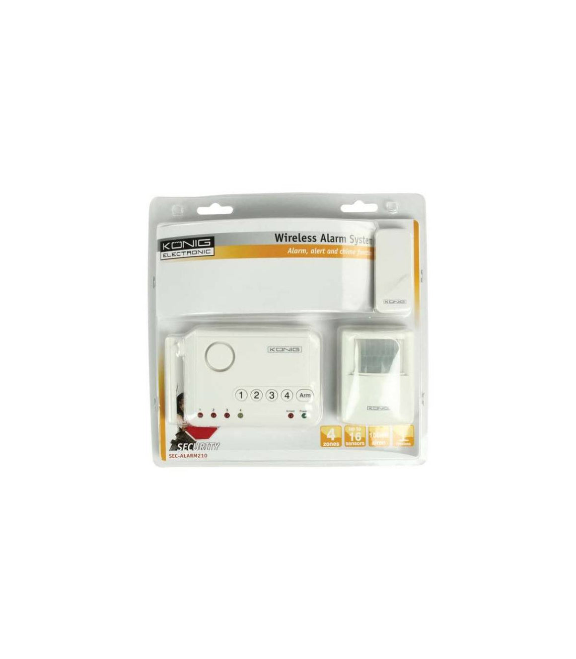 Sistem de alarma fara fir Konig SEC-ALARM210. SEC-ALARM210 este un sistem de alarma wireless usor de instalat. Acesta va permite sa va creati un sistem de alarma complet prin utilizarea senzorilor optionali. Centrul de comanda asigura trei zone cu functii de alarma / alerta / clopotel si o a patra functie dedicata doar notificarii de alerta. Centrul de comanda compact contine o tastatura cu cinci butoane indicatori tonuri audio si o sirena interna de 105dB. Un numar total de 16 senzori (4 pe zona) poate fi adaugat sistemului pentru a crea o acoperire completa a casei sau biroului dvs. Senzori optional: SEC-ASDW10 usa / senzor de fereastra sau SEC-ASMS10 de detectare a senzorului de miscare (PIR) Alarma panou. Putere: 12 V DC/100 mA. Back-up de putere: 4x baterie AAA (nu sunt incluse). Sirena: 105 dB. Frecventa: 433 MHz. Putere: baterie 9 V (nu sunt incluse). Gama propunere de detectare: 110 / 12 m. Sensibilitate: reglabila. Potrivit pentru utilizare in interior sau in aer liber. Usi / ferestre de senzori. Frecventa: 433 MHz. Putere: baterie CR2032 (incluse) Marca: KONIG Marca: KONIG Garantie: 24 luni persoane fizice / 12 luni persoane juridice