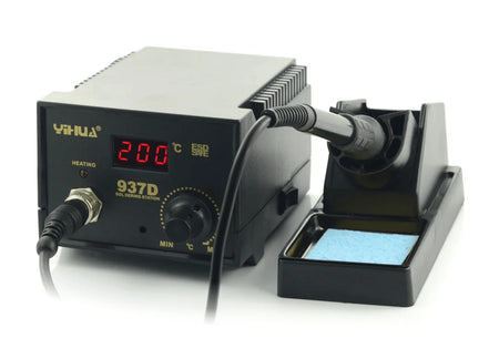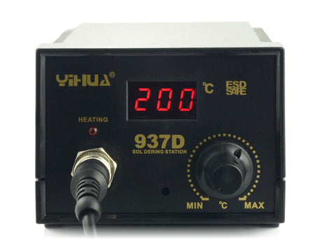 Statie de lipit Yihua 937D cu o capacitate de 50 W cu un interval de temperatura reglabil de la 200 °C la 480 °C. Are element de incalzire ceramic si indicator digital de temperatura cu afisaj LED care arata temperatura setata a varfului. Produsul este trimis într-o culoare aleatorie (negru sau verde).