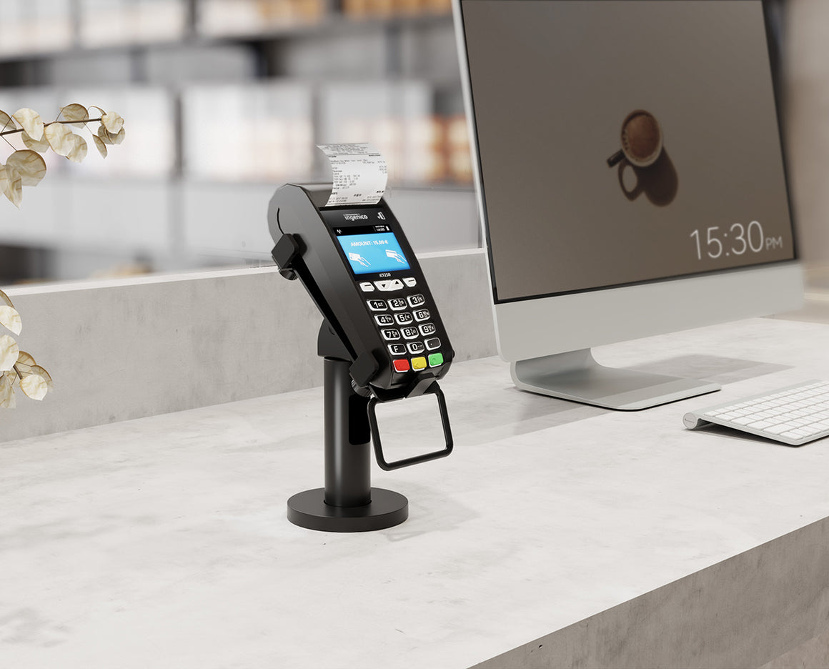Clipurile de montare captusite pot fi reglate cu usurinta la latimea dispozitivului. Cu articulaţia flexibila si manerul integrat, clientii dumneavoastra pot roti si inclina cu usurinta terminalul in orice directie.