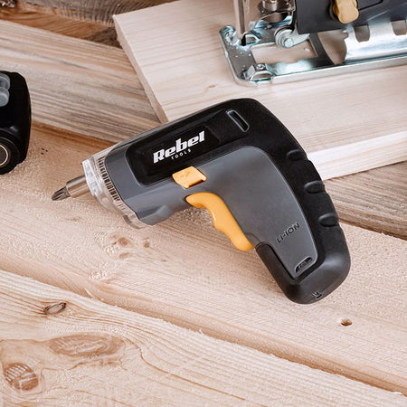 Dupa o perioada de utilizare te vei convinge cat de comfortabila este surubelnita cu acumulator Rebel Tools! Produsul este dotat cu prindere metalica, deci schimbarea varfului este foarte rapida. Produsul are si lumina de lucru, ce ilumineaza atunci cand vrei sa insurubezi. Confortul in utilizare sporeste datorita utilizarii fara fir, ceea ce permite libertate de miscare. Bateria litiu-ion cu o capacitate de 2 Ah garanteaza eficienta ridicata si o durata lunga de functionare. In plus, produsul este foarte usor, are doar 380 g, ceea ce sporeste confortul in utilizare.
